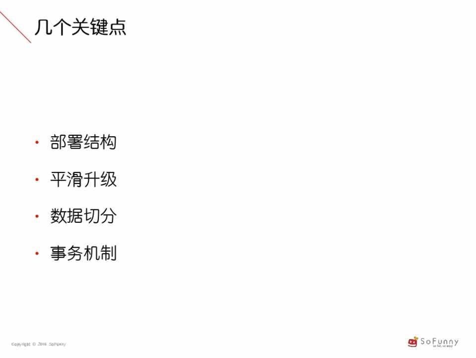 • 部署结构 • 平滑升级 • 数据切分 • 事务机制