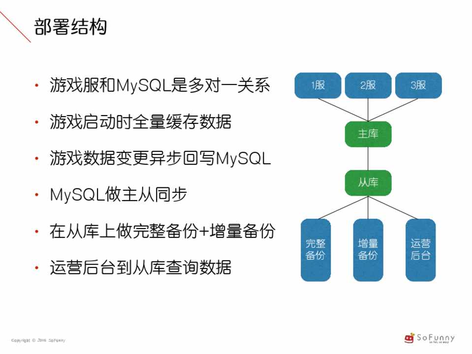 • 游戏启动时全量缓存数据 • 游戏数据变更异步回写MySQL • MySQL做主从同步