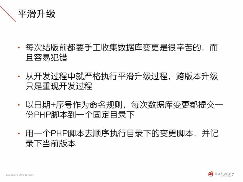• 以日期+序号作为命名规则,每次数据库变更都提交一 份PHP脚本到一个固定目录下