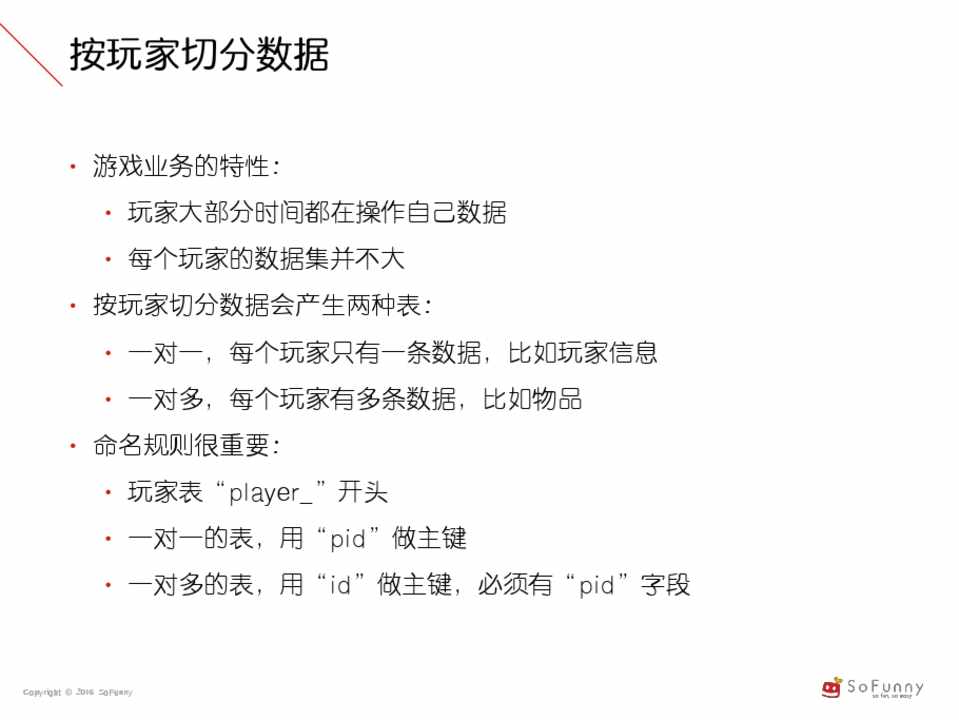 • 按玩家切分数据会产生两种表: • 一对一,每个玩家只有一条数据,比如玩家信息 • 一对多,每个玩家有多条数据,比如物品