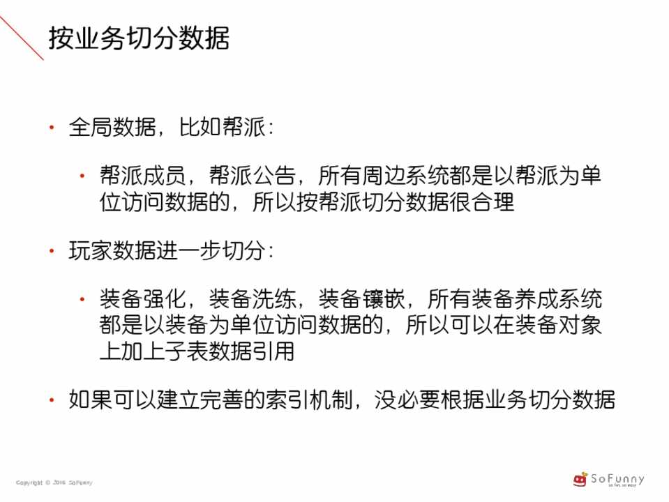 • 全局数据,比如帮派: • 帮派成员,帮派公告,所有周边系统都是以帮派为单 位访问数据的,所以按帮派切分数据很合理
