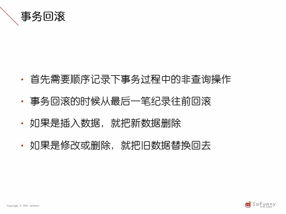 • 首先需要顺序记录下事务过程中的非查询操作 • 事务回滚的时候从最后一笔纪录往前回滚 • 如果是插入数据,就把新数据删除 • 如果是修改或删除,就把旧数据替换回去