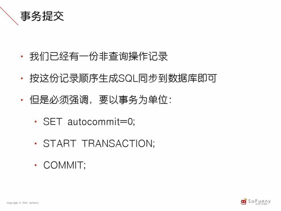 • 我们已经有一份非查询操作记录 • 按这份记录顺序生成SQL同步到数据库即可 • 但是必须强调,要以事务为单位: