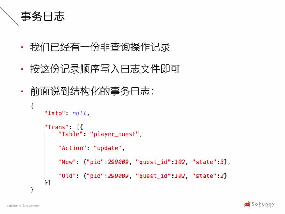 • 我们已经有一份非查询操作记录 • 按这份记录顺序写入日志文件即可 • 前面说到结构化的事务日志: