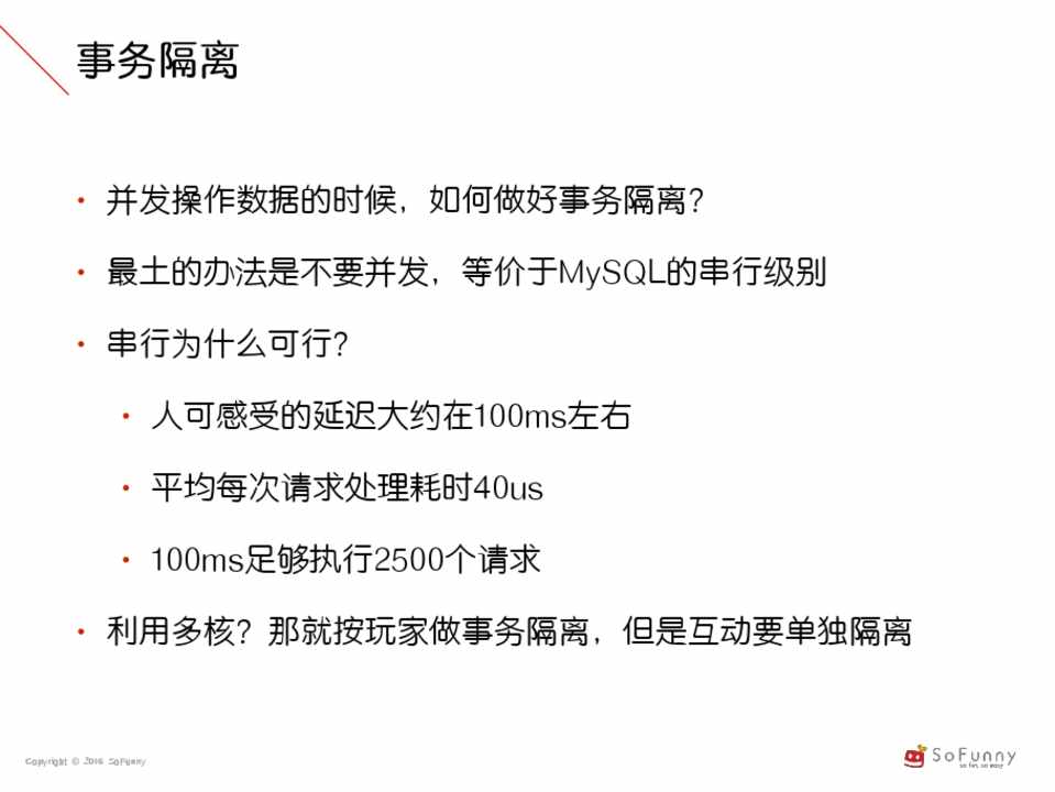 • 人可感受的延迟大约在100ms左右 • 平均每次请求处理耗时40us • 100ms足够执行2500个请求 • 利用多核?那就按玩家做事务隔离,但是互动要单独隔离