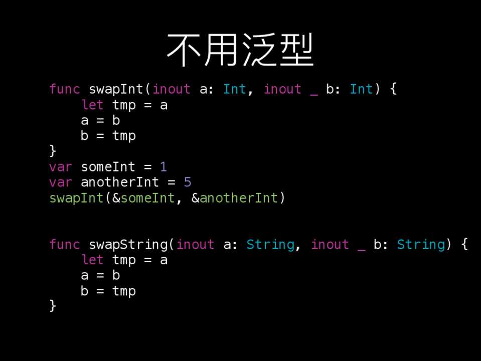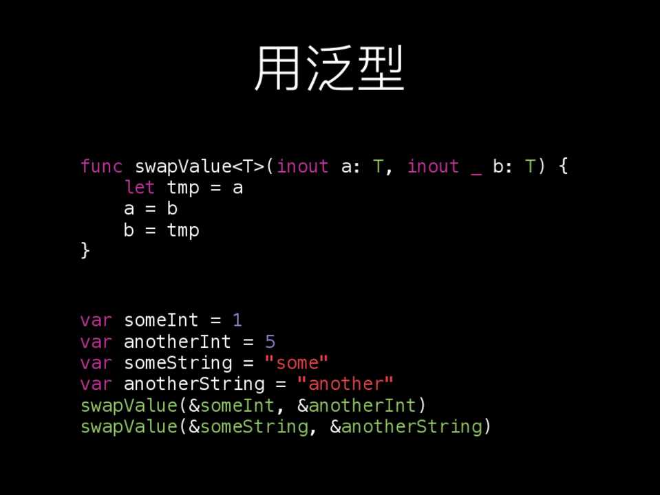 func swapValue<T>(inout a: T, inout _ b: T) { let tmp = a a=b b = tmp