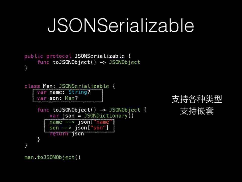 var json = JSONDictionary() name --> json["name"] son --> json["son"] return json } } man.toJSONObject()