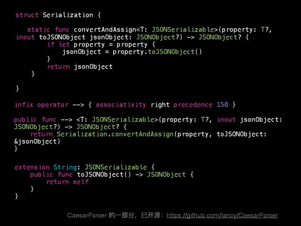 } } infix operator --> { associativity right precedence 150 } public func --> <T: JSONSerializable>(property: T?, inout jsonObject: JSONObject?) -> JSONObject? {
