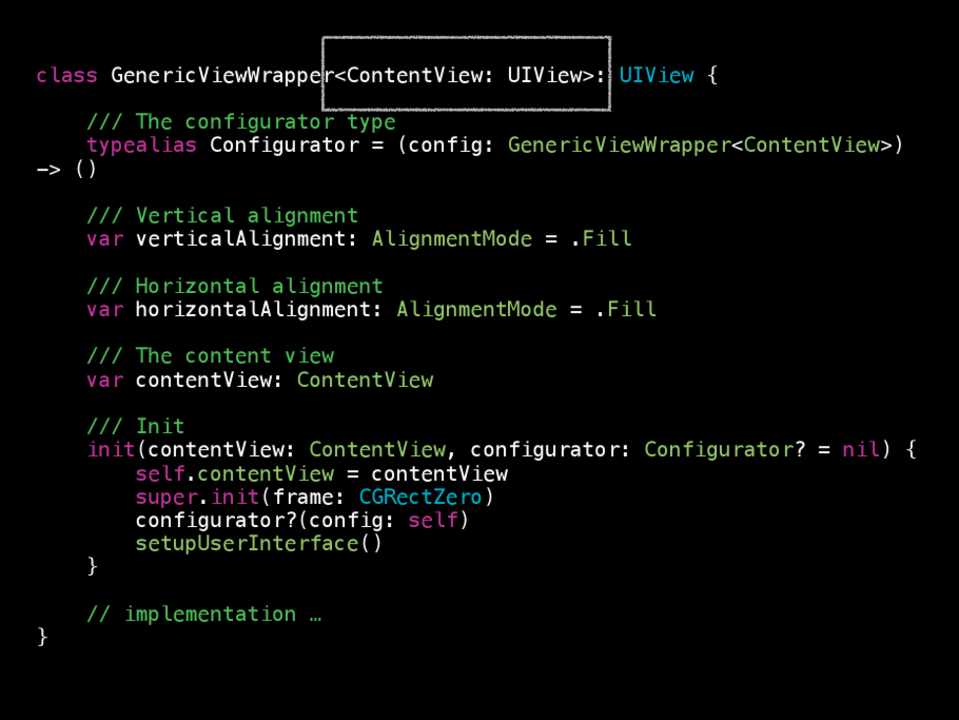 class GenericViewWrapper<ContentView: UIView>: UIView { /// The configurator type typealias Configurator = (config: GenericViewWrapper<ContentView>)