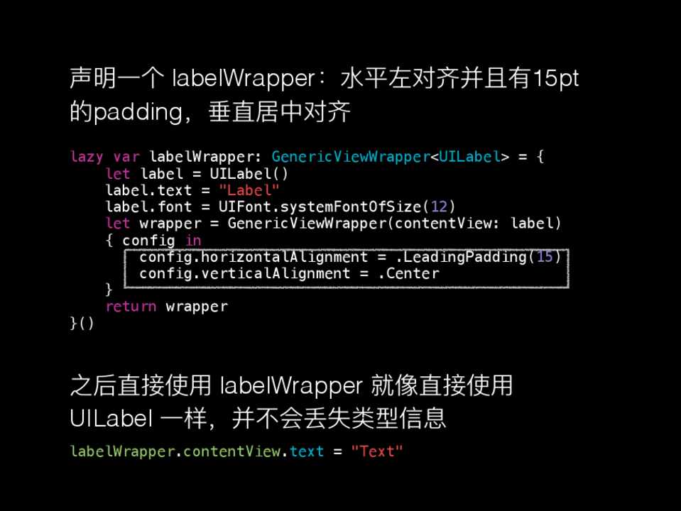 lazy var labelWrapper: GenericViewWrapper<UILabel> = { let label = UILabel() label.text = "Label" label.font = UIFont.systemFontOfSize(12) let wrapper = GenericViewWrapper(contentView: label) { config in config.horizontalAlignment = .LeadingPadding(15) config.verticalAlignment = .Center } return wrapper