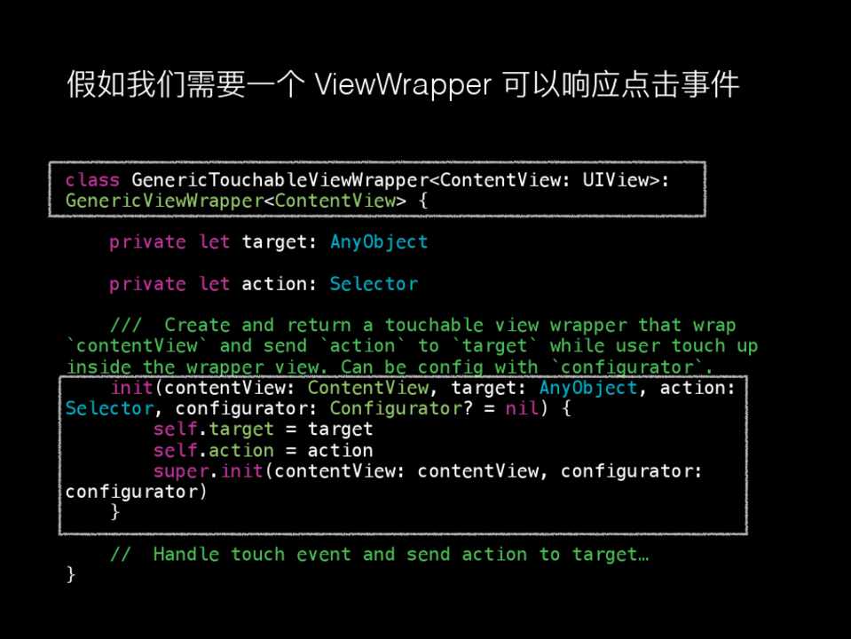 self.target = target self.action = action super.init(contentView: contentView, configurator: configurator) } // Handle touch event and send action to target… }