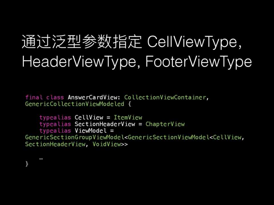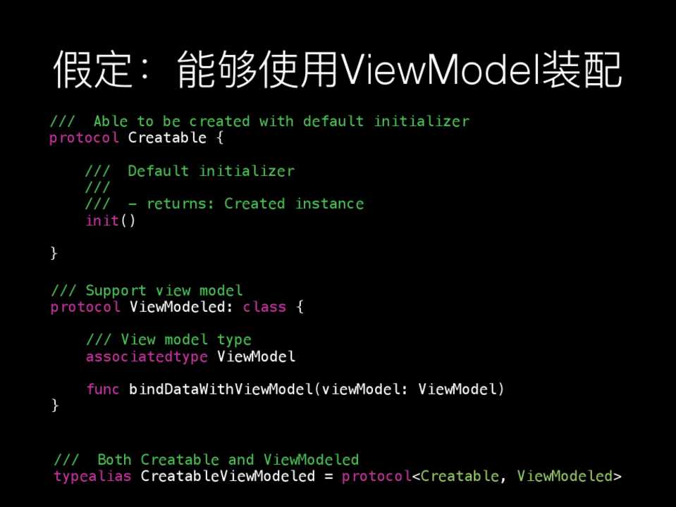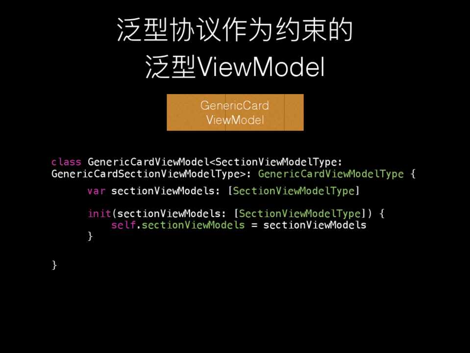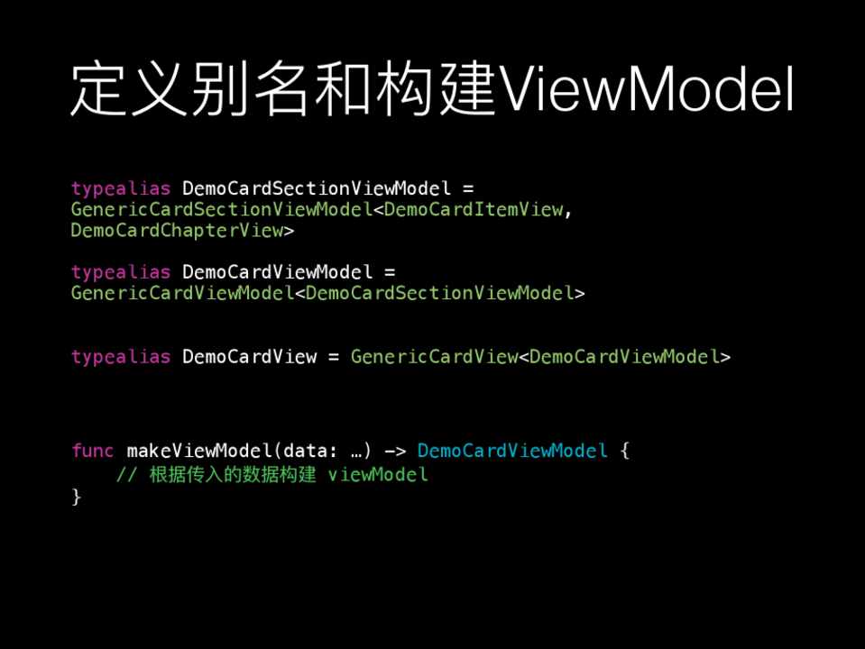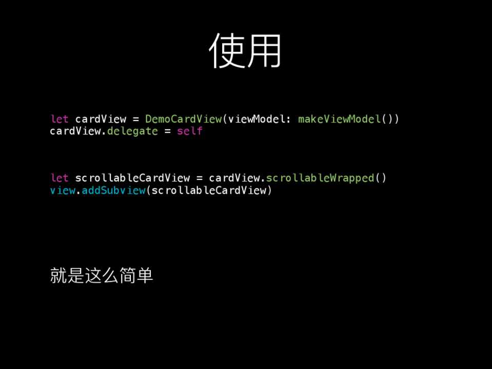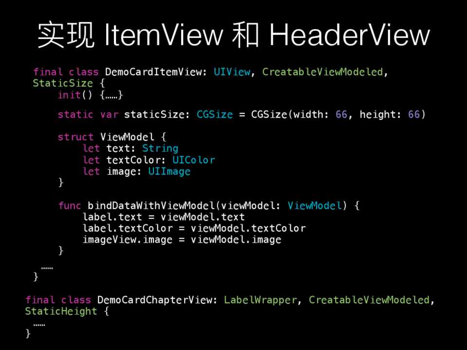let text: String let textColor: UIColor let image: UIImage } func bindDataWithViewModel(viewModel: ViewModel) { label.text = viewModel.text label.textColor = viewModel.textColor imageView.image = viewModel.image } …… } final class DemoCardChapterView: LabelWrapper, CreatableViewModeled, StaticHeight { …… }