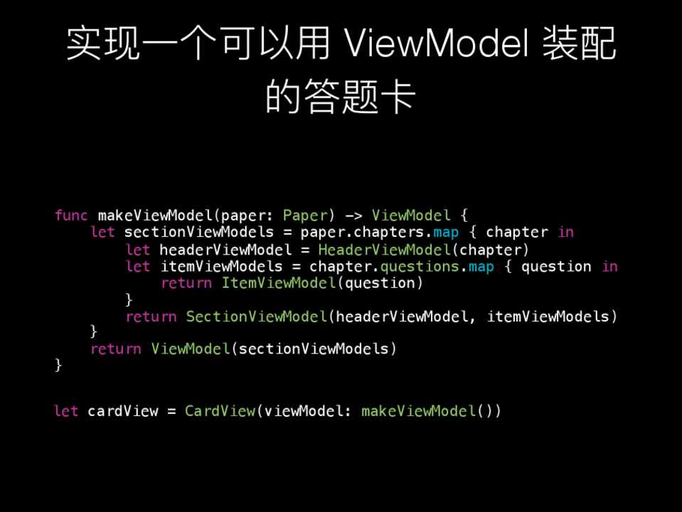 func makeViewModel(paper: Paper) -> ViewModel { let sectionViewModels = paper.chapters.map { chapter in let headerViewModel = HeaderViewModel(chapter) let itemViewModels = chapter.questions.map { question in return ItemViewModel(question) } return SectionViewModel(headerViewModel, itemViewModels) } return ViewModel(sectionViewModels)