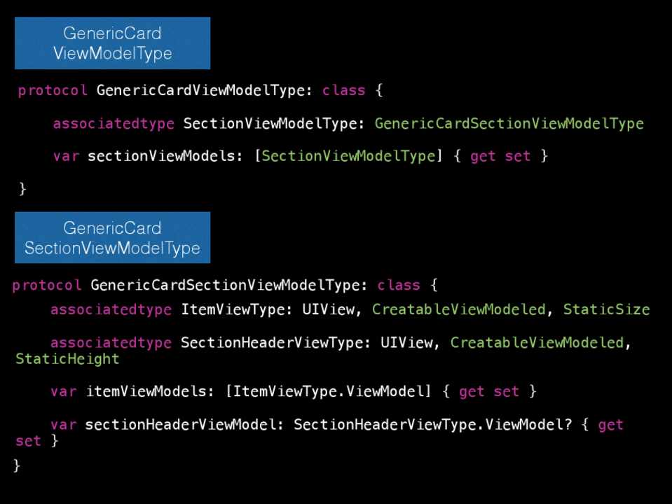 protocol GenericCardSectionViewModelType: class { associatedtype ItemViewType: UIView, CreatableViewModeled, StaticSize associatedtype SectionHeaderViewType: UIView, CreatableViewModeled,