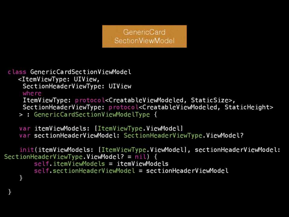 class GenericCardSectionViewModel <ItemViewType: UIView, SectionHeaderViewType: UIView where ItemViewType: protocol<CreatableViewModeled, StaticSize>, SectionHeaderViewType: protocol<CreatableViewModeled, StaticHeight> > : GenericCardSectionViewModelType { var itemViewModels: [ItemViewType.ViewModel] var sectionHeaderViewModel: SectionHeaderViewType.ViewModel? init(itemViewModels: [ItemViewType.ViewModel], sectionHeaderViewModel: