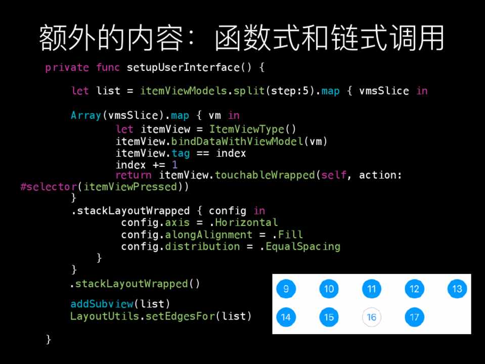 #selector(itemViewPressed)) } .stackLayoutWrapped { config in config.axis = .Horizontal config.alongAlignment = .Fill config.distribution = .EqualSpacing } } .stackLayoutWrapped()