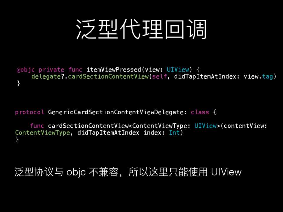 protocol GenericCardViewDelegate: class { func cardView<CardViewType: UIView>(contentView: CardViewType,