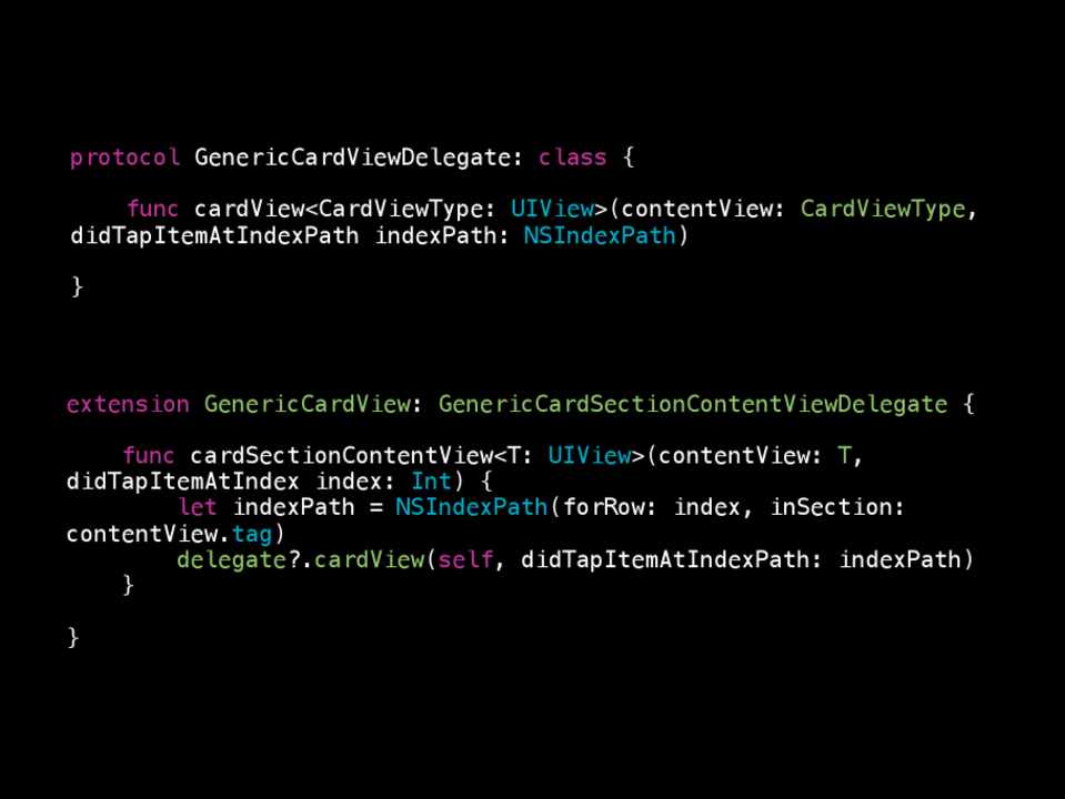extension GenericCardView: GenericCardSectionContentViewDelegate { func cardSectionContentView<T: UIView>(contentView: T,