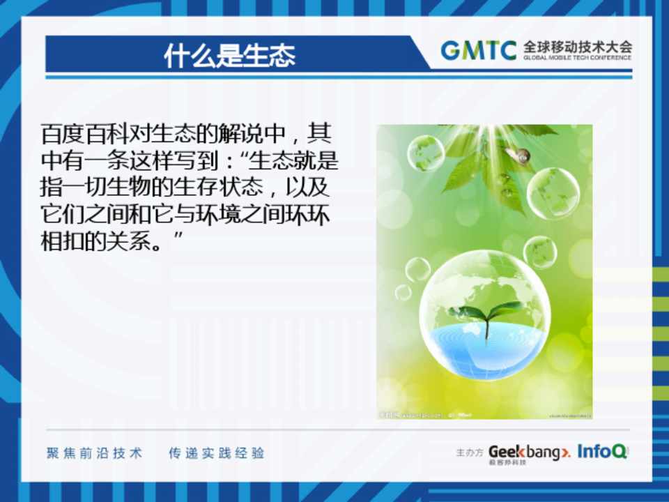 百度百科对生态的解说中,其 中有一条这样写到:“生态就是 指一切生物的生存状态,以及 它们之间和它与环境之间环环 相扣的关系。”