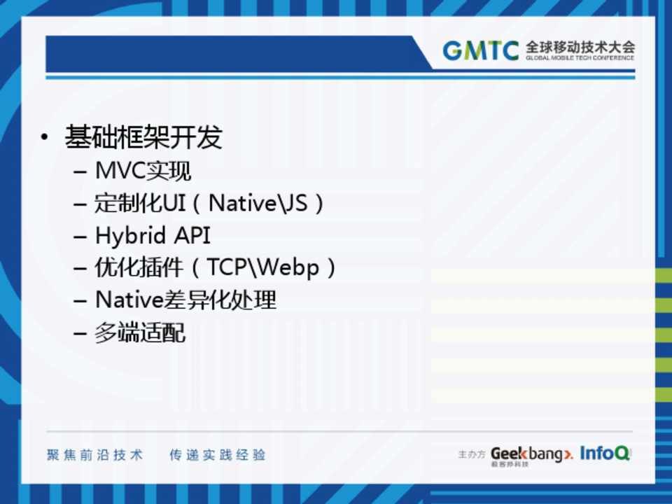 – MVC实现 – 定制化UI(Native\JS) – Hybrid API – 优化插件(TCP\Webp) – Native差异化处理 – 多端适配