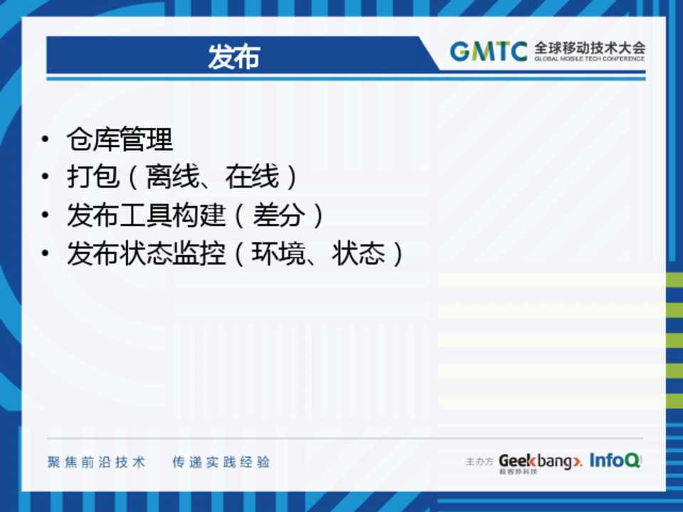 • 仓库管理 • 打包(离线、在线) • 发布工具构建(差分) • 发布状态监控(环境、状态)
