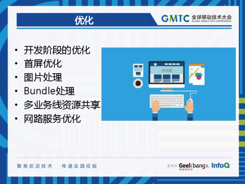 • 开发阶段的优化 • 首屏优化 • 图片处理 • Bundle处理 • 多业务线资源共享 • 网路服务优化