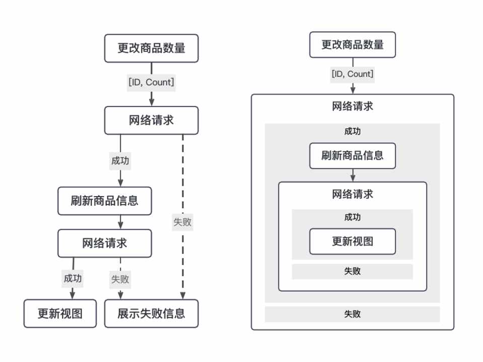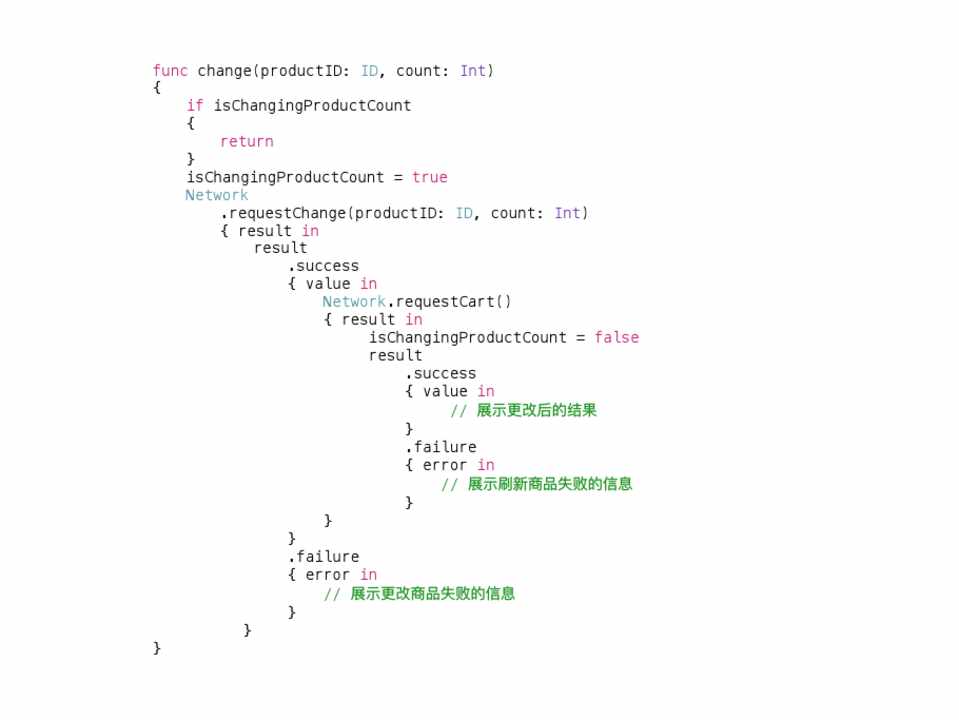 result .success { value in Network.requestCart() { result in isChangingProductCount = false result .success { value in