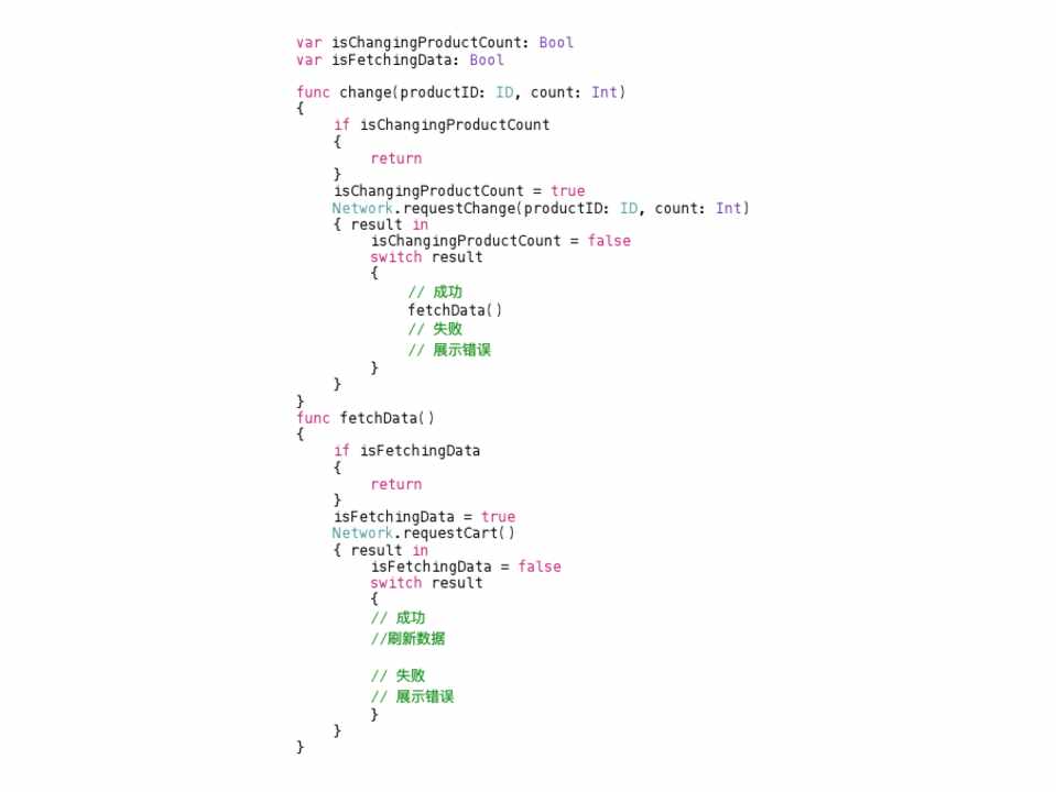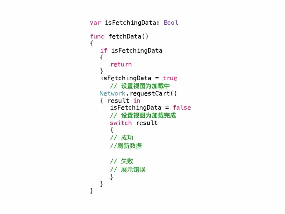 // fetchData() // // } } } func fetchData() { if isFetchingData { return } isFetchingData = true Network.requestCart() { result in isFetchingData = false switch result { // //