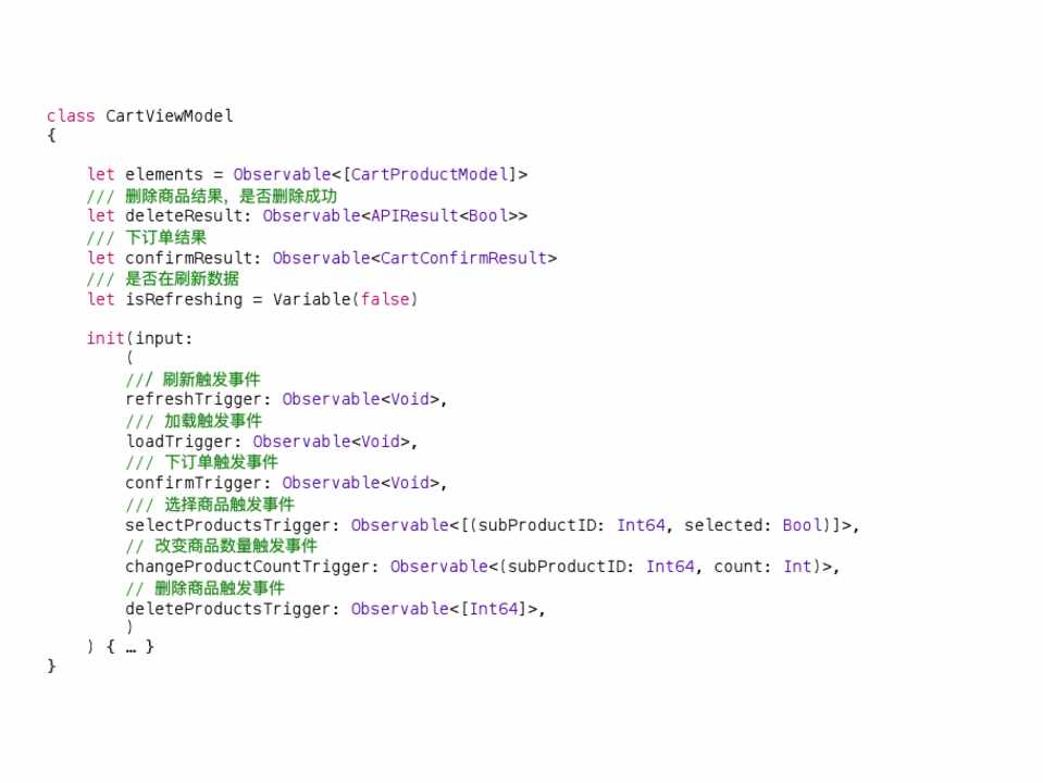init(input: ( // refreshTrigger: Observable<Void>, /// loadTrigger: Observable<Void>, /// confirmTrigger: Observable<Void>, /// selectProductsTrigger: Observable<[(subProductID: Int64, selected: Bool)]>, // changeProductCountTrigger: Observable<(subProductID: Int64, count: Int)>, // deleteProductsTrigger: Observable<[Int64]>, )