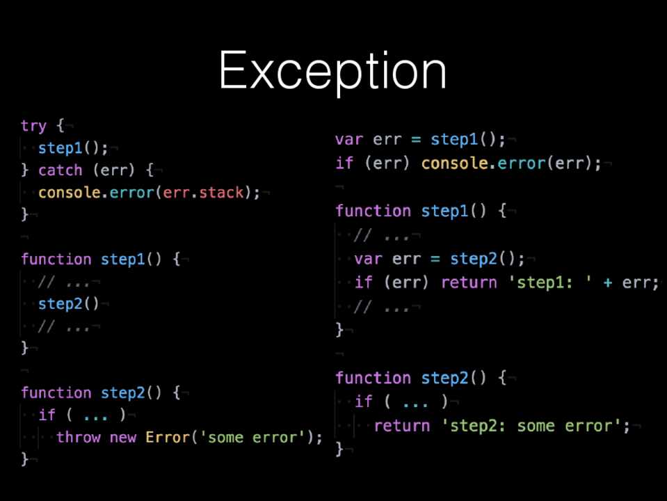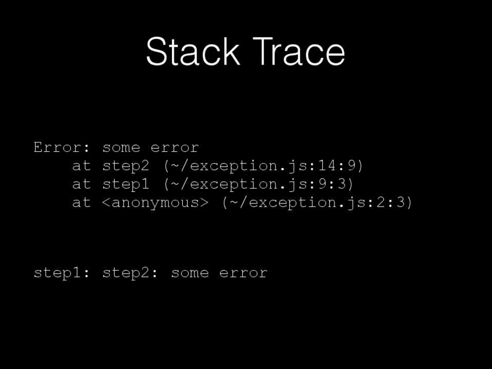 Error: some error at step2 (~/exception.js:14:9) at step1 (~/exception.js:9:3) at <anonymous> (~/exception.js:2:3)