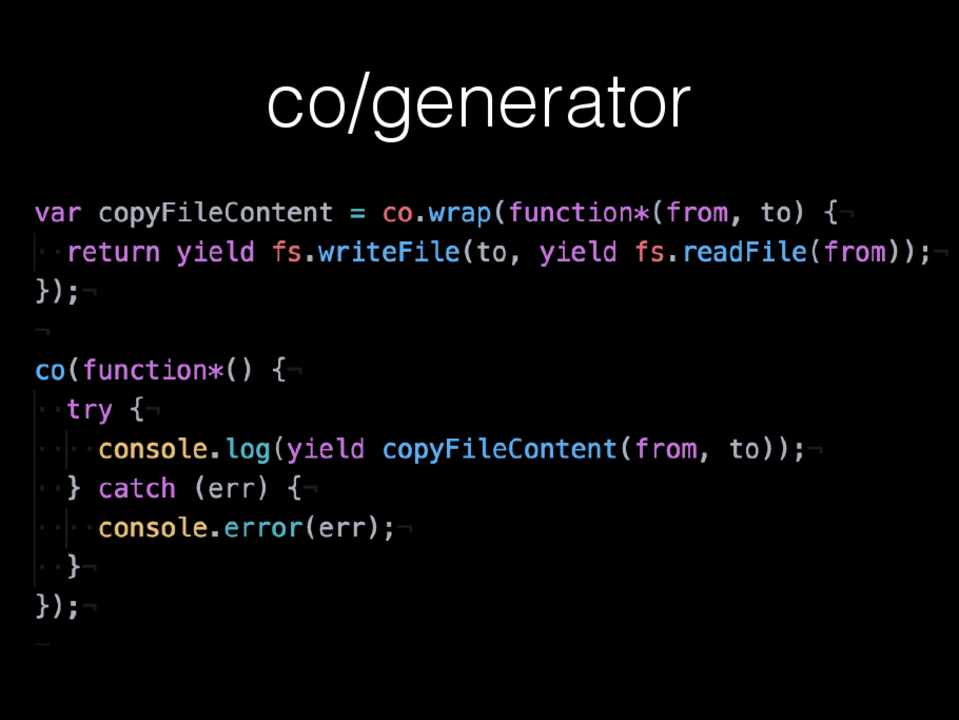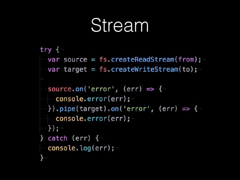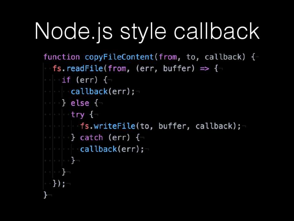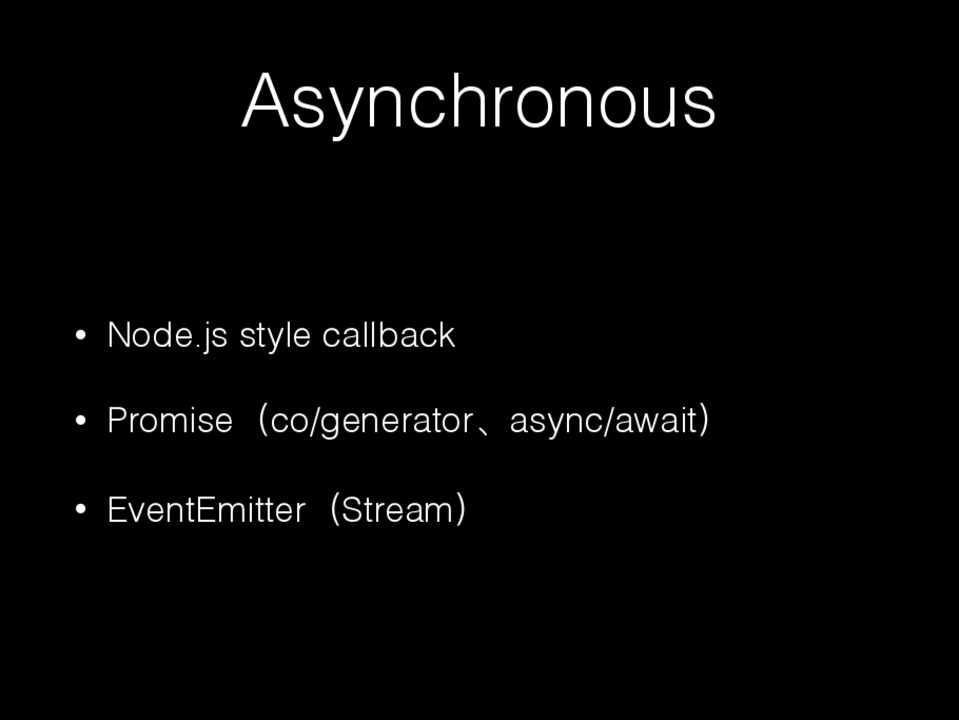 • Node.js style callback • Promise co/generator async/await • EventEmitter Stream