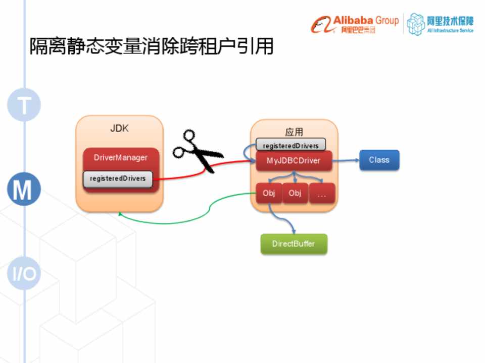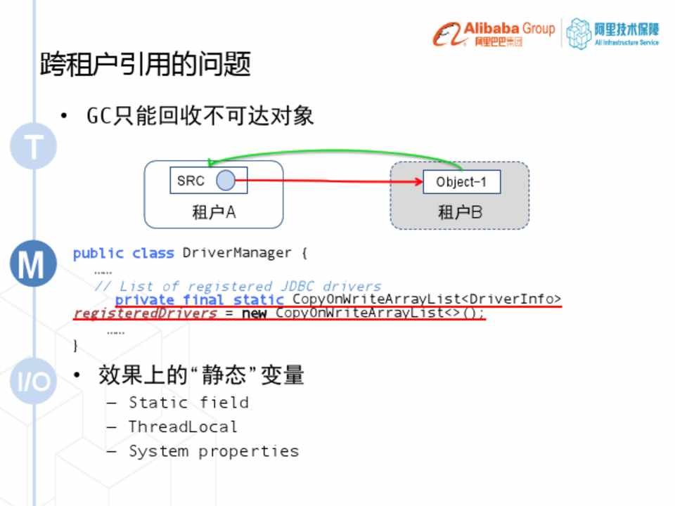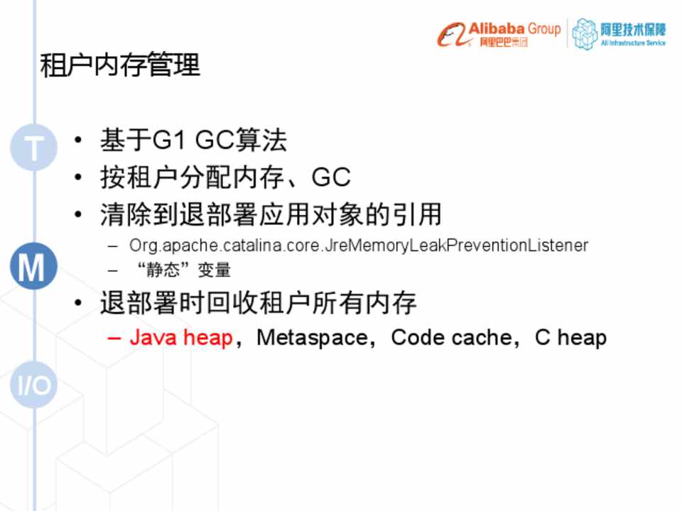 M – Org.apache.catalina.core.JreMemoryLeakPreventionListener – “静态”变量 • 退部署时回收租户所有内存 – Java heap,Metaspace,Code cache,C heap