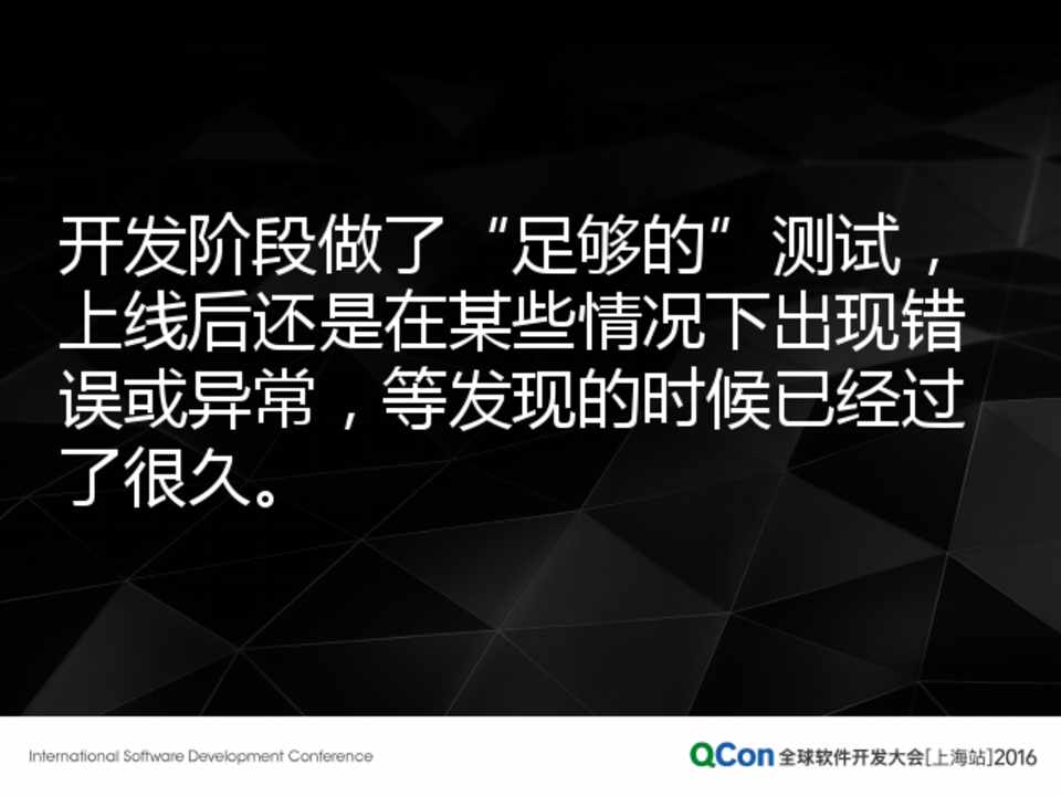 开发阶段做了“足够的”测试, 上线后还是在某些情况下出现错 误或异常,等发现的时候已经过 了很久。