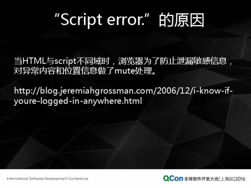 当HTML与script不同域时,浏览器为了防止泄漏敏感信息, 对异常内容和位置信息做了mute处理。 http://blog.jeremiahgrossman.com/2006/12/i-know-ifyoure-logged-in-anywhere.html