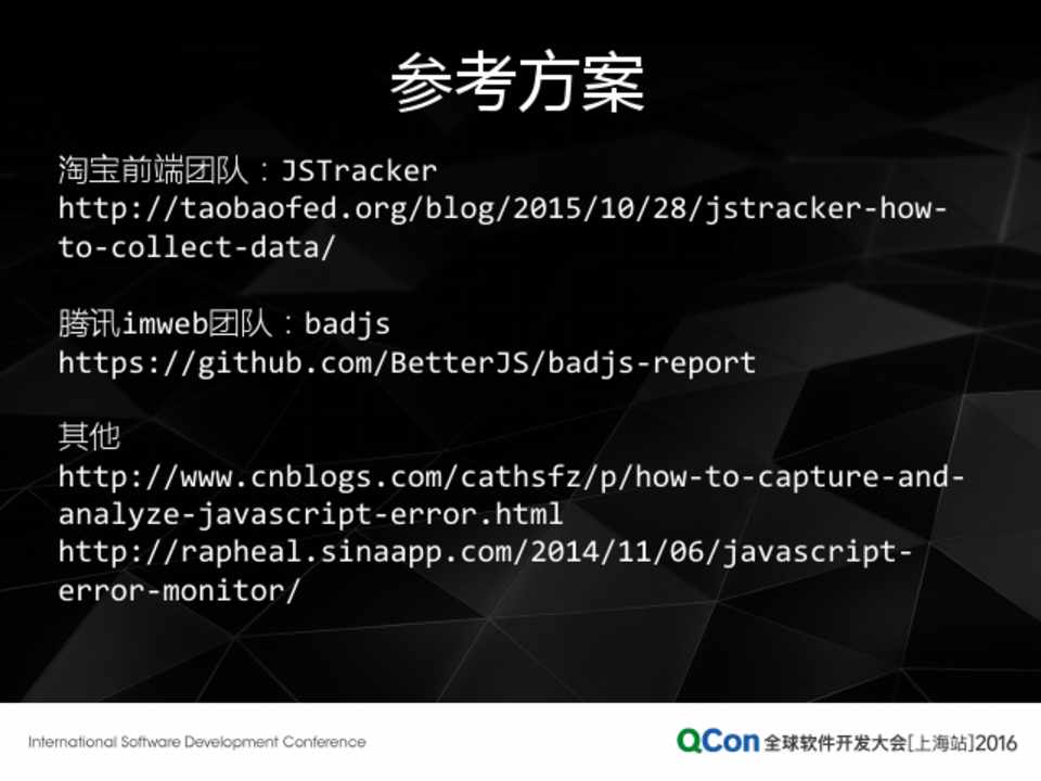 淘宝前端团队:JSTracker http://taobaofed.org/blog/2015/10/28/jstracker-howto-collect-data/ 腾讯imweb团队:badjs https://github.com/BetterJS/badjs-report 其他 http://www.cnblogs.com/cathsfz/p/how-to-capture-andanalyze-javascript-error.html http://rapheal.sinaapp.com/2014/11/06/javascripterror-monitor/
