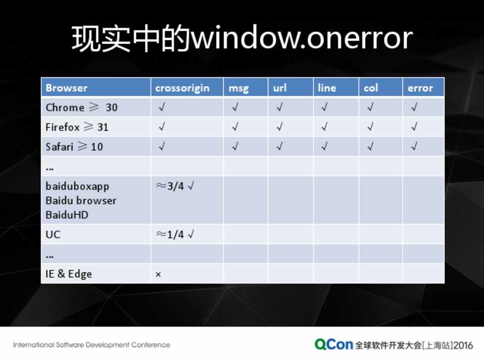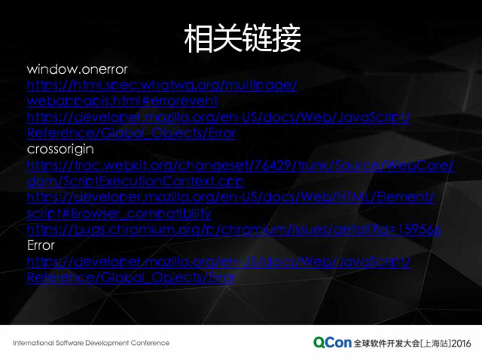 window.onerror https://html.spec.whatwg.org/multipage/ webappapis.html#errorevent https://developer.mozilla.org/en-US/docs/Web/JavaScript/ Reference/Global_Objects/Error crossorigin https://trac.webkit.org/changeset/76429/trunk/Source/WebCore/ dom/ScriptExecutionContext.cpp https://developer.mozilla.org/en-US/docs/Web/HTML/Element/ script#Browser_compatibility https://bugs.chromium.org/p/chromium/issues/detail?id=159566 Error https://developer.mozilla.org/en-US/docs/Web/JavaScript/ Reference/Global_Objects/Error