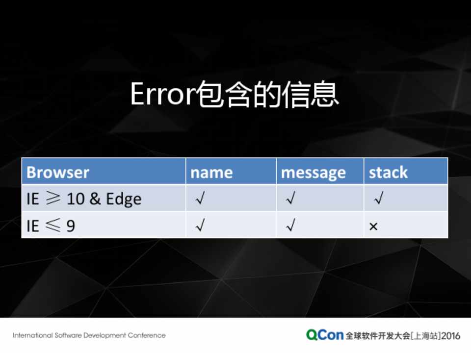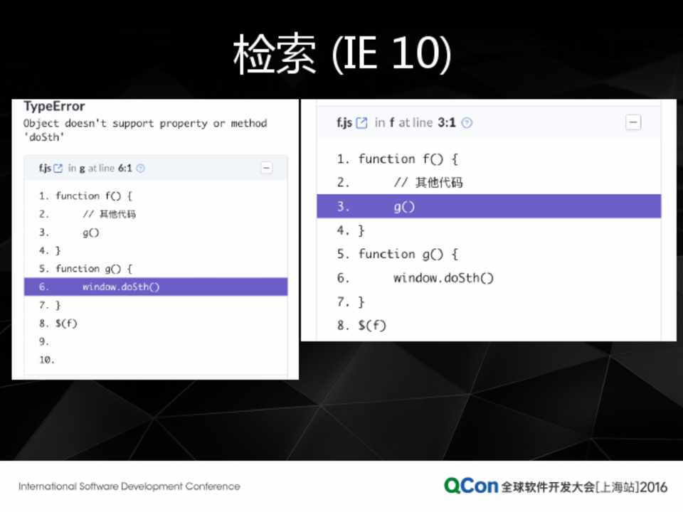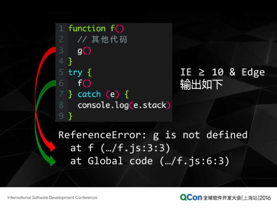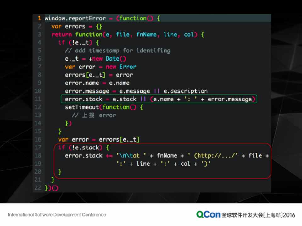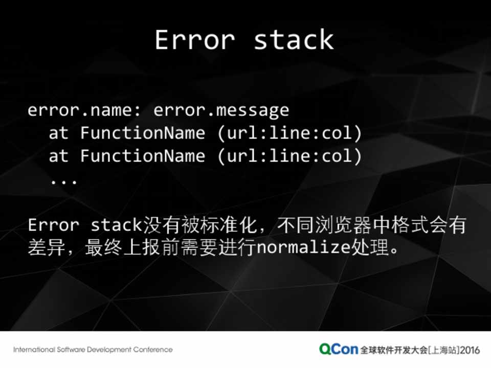 error.name:error.message atFunctionName(url:line:col) atFunctionName(url:line:col) ... Errorstack没有被标准化,不同浏览器中格式会有 差异,最终上报前需要进⾏normalize处理。