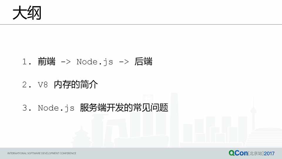 1. 前端 -> Node.js -> 后端 2. V8 内存的简介 3. Node.js 服务端开发的常见问题