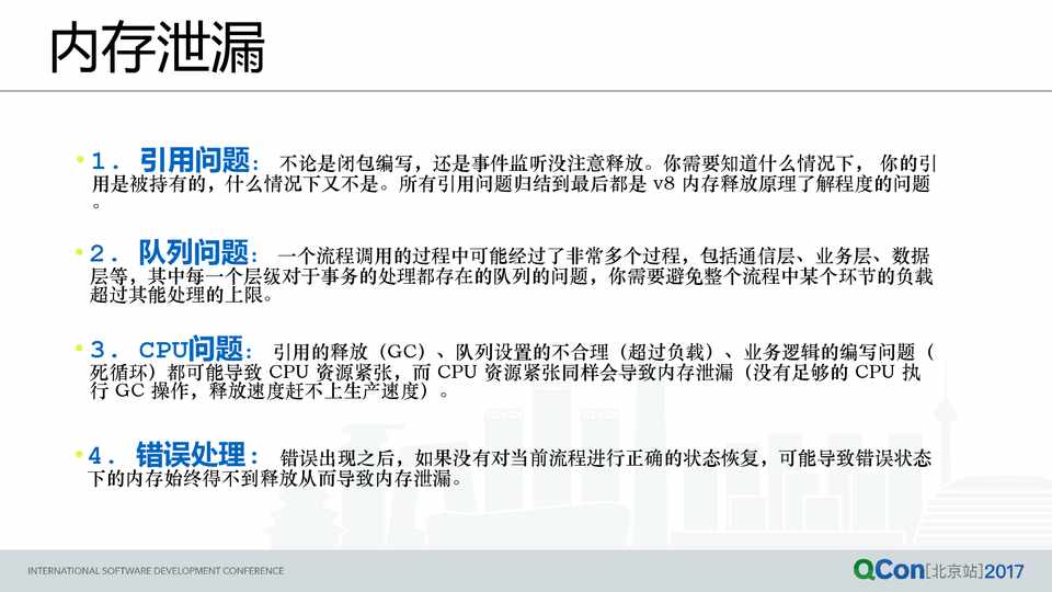 • 1. 引用问题: 不论是闭包编写,还是事件监听没注意释放。你需要知道什么情况下, 你的引