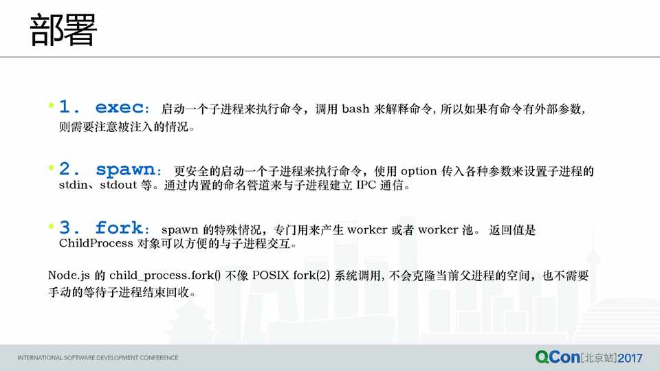 • 3. fork: spawn 的特殊情况,专门用来产生 worker 或者 worker 池。 返回值是