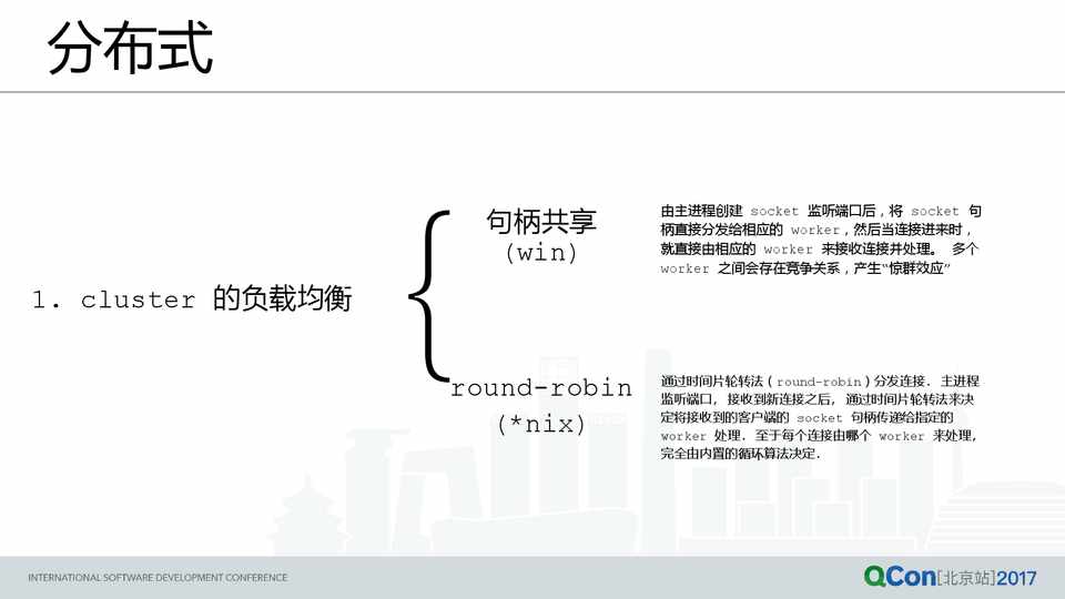 通过时间片轮转法(round-robin)分发连接. 主进程 监听端口, 接收到新连接之后, 通过时间片轮转法来决 定将接收到的客户端的 socket 句柄传递给指定的 worker 处理. 至于每个连接由哪个 worker 来处理, 完全由内置的循环算法决定.