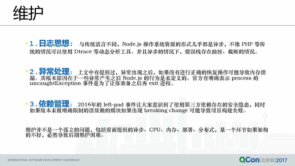 维护并不是一个孤立的问题,包括前面提到的异步、CPU、内存、部署、分布式,某一个环节如果架构 的不好,必然导致后期维护困难。
