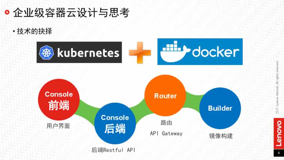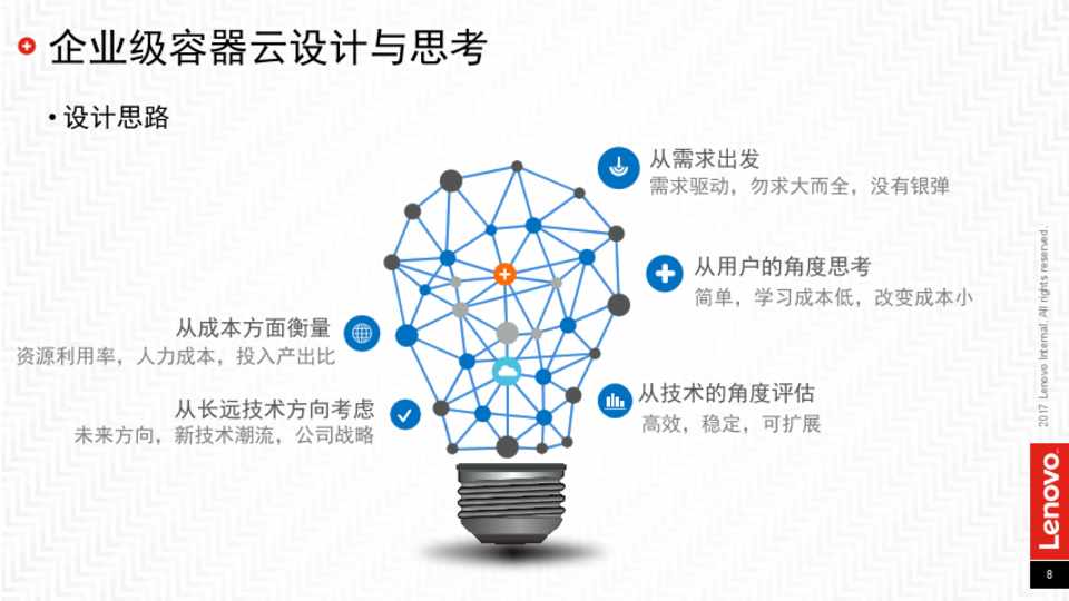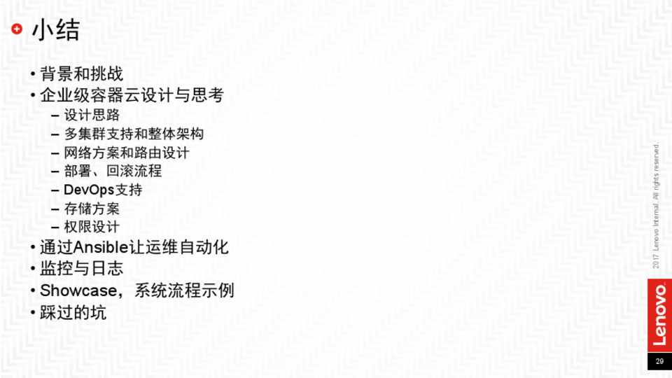 • 背景和挑战 • 企业级容器云设计与思考 • 让一切自动化 • 监控与日志 • Showcase • 那些坑,那些事