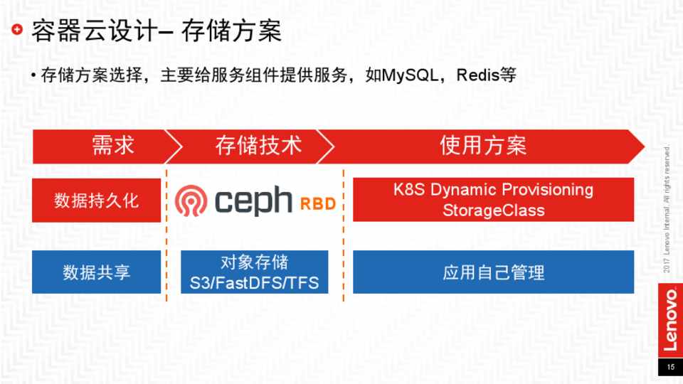 • 存储方案选择,主要给服务组件提供服务,如MySQL,Redis等