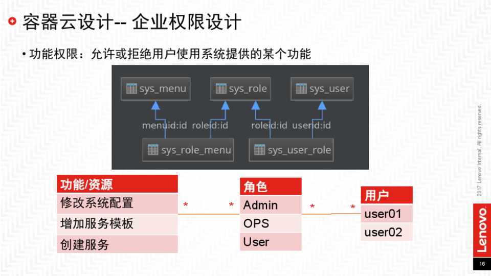 • 功能权限:允许或拒绝用户使用系统提供的某个功能