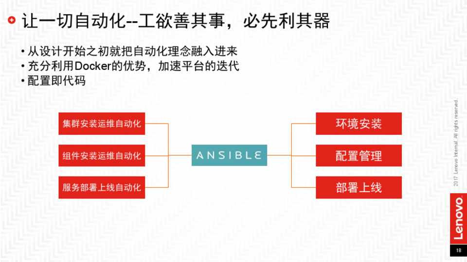 • 从设计开始之初就把自动化理念融入进来 • 充分利用Docker的优势,加速平台的迭代 • 配置即代码