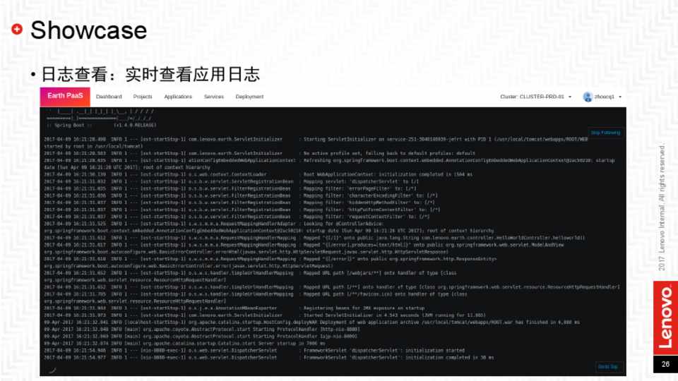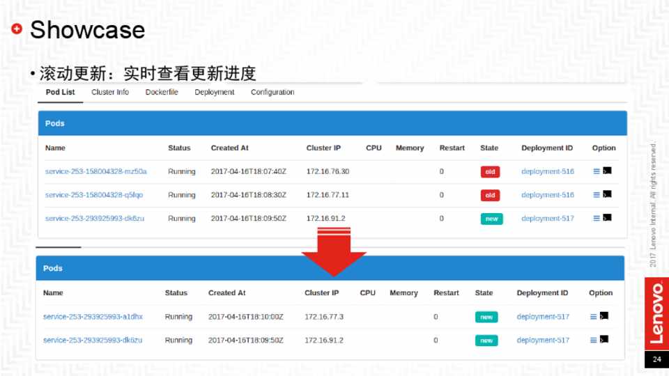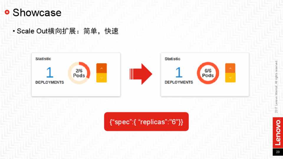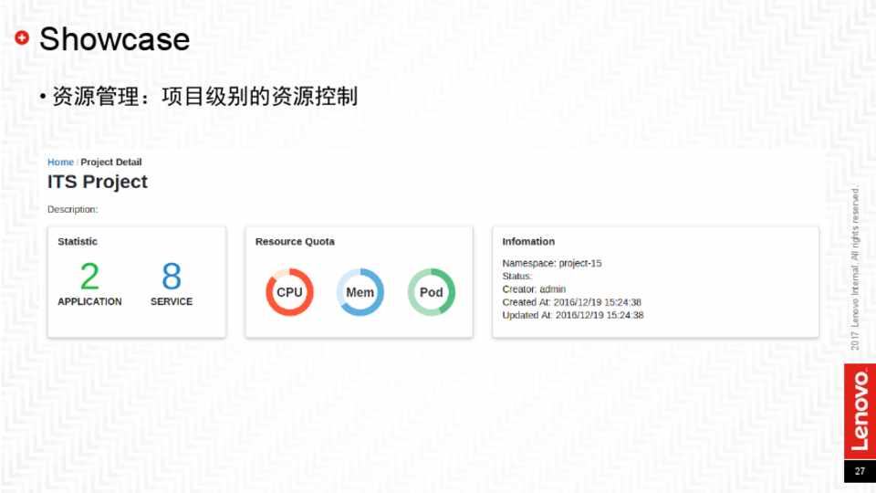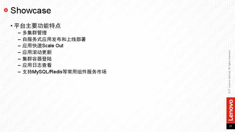 – 多集群管理 – 自服务式应用发布和上线部署 – 应用快速Scale Out – 应用滚动更新 – 集群容器登陆 – 应用日志查看 – 支持MySQL/Redis等常用组件服务市场