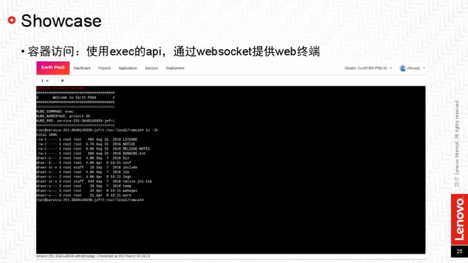 • 容器访问:使用exec的api,通过websocket提供web终端