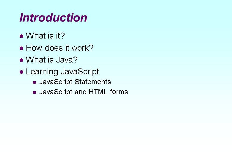 Examples should be shown which demonstrate different uses of JavaScript. For example, try the calculator example at the address shown.