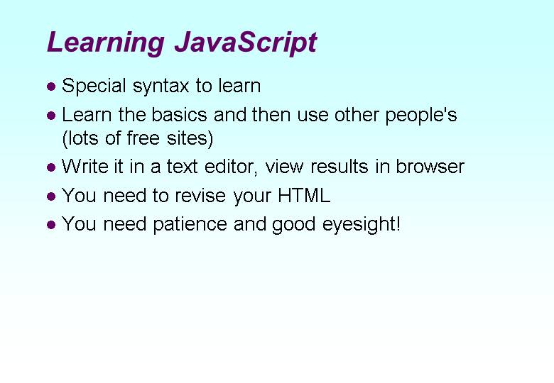 However, a good strategy is to learn the basics, and then use and adapt other people's JavaScript. There are plenty of sites on the internet offering free JavaScript (see slide 4) with the calculator example. Other useful addresses are provided in the notes of last slide.
